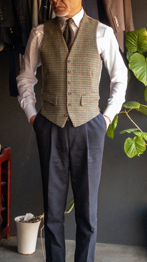 画像は私の先日のコーディネート、コーデュロイ(Brisbane Moss の 3101X)のジャケットにフランネルのウエストコート(ベスト)とネクタイ、そしてモールスキン(Kunishima)のトラウザーズです。